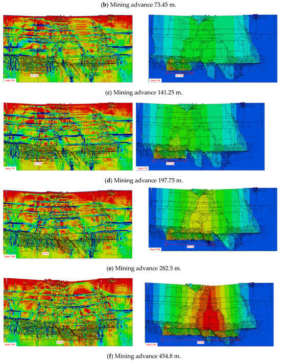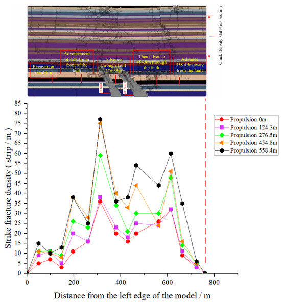 It can be seen from Figure 11 that the roof crack density shows a four-stage evolution trend with the advancing distance of the working face: In the first stage, the advancing distance of the working face increases from 0 m to 124.3 m (that is, the working face has not yet crossed faults), the fissures formed after the mining of the 2 # coal seam are compacted due to the disturbance of 5 # coal seam mining, and some new fissures are produced at the same time. Under the influence of the two, the growth is not obvious. In the second and third stages, the advancing distance of the working face is from 124.3 m to 276.85 m. At this time, the working face passes through faults for the first time and the second time, respectively, and it can be observed that the fracture density increases obviously at this time. When the working face pushed through the fault at 30 m (Figure 9d), due to the poor mechanical properties of the fault, and under the influence of the superposition effect of mining stress of 2 # coal and 5 # coal, the stress concentration appeared on the hanging wall of the fault and was larger than the conventional position. After passing through the fault zone, the fault zone is broken and the stress is released. The mudstone and siltstone of the 5 # coal roof are broken along the fault. The cracks of the fault itself and a large number of newly generated cracks extend upward and propagate to the upper roof, and the density of the strike cracks increases obviously. When the mining advance is 276.85 m (Figure 9e), the hanging wall and footwall of the fault have stress concentration and are larger than the conventional position. When the working face is 454.8 m (Figure 9f). The mudstone and siltstone of the roof have been broken, the fault zone is broken, the stress is released, the cracks of the fault itself and a large number of newly generated cracks extend upward and propagate to the upper roof, and the density of the strike cracks increases obviously. In the fourth stage, the advancing distance of the working face is from 276.85 m to 558.4 m. The overlying rock in the goaf is gradually caving and compacting, and some new fissures are produced at the same time. The overall growth trend slows down and the local density increases.