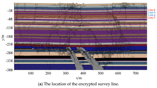 Data of line 6 showed a slightly increasing overall trend in terms of crack width due to the overall movement of the overburden rock mass and the impact of subsidence. However, given that the overall change was not significant, it was inferred that the developed fissures did not reach measurement line 6. Therefore, the survey line was encrypted between survey line 5 and 6, and the distance between lines a and b and 5 # coal is 226 m and 236 m, respectively. The results are shown in Figure 10. It can be seen that the height of the final hydraulic fracture was in the interval of 216 m~226 m.