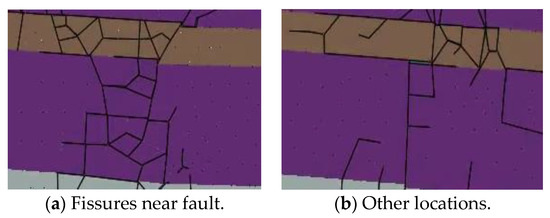 It can be seen from Figure 8 and Figure 9 that the overburden fracture zone near the fault zone showed different characteristics from other areas. In the process of continuous advancement of the working face, due to the concentration of stress in the geological structure, new rock fractures formed. These cracks and fissures formed a fracture zone, which made the fracture zone near the fault denser (Figure 10 and Figure 11). The overburden fracture zone near the fault zone was generally more continuous, because the existence of the fault zone provided continuous stress and promoted the formation and growth of the fracture zone (Figure 9 and Figure 12).