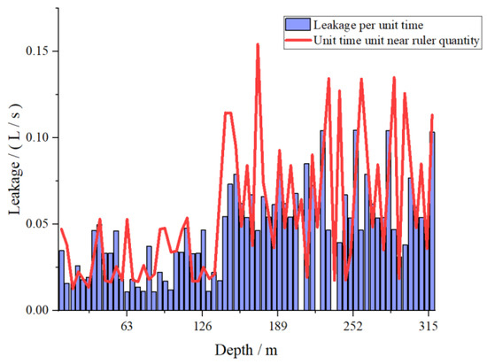 From the post-mining leakage test involving the hole, it was found that the first instance where there was no water return in the hole was when the hole depth was 140 m, and the maximum leakage amount was 0.0493 L/s. Then, there was no water return again at 141.09 m. The leakage per unit of time at this location was 0.0565 L/s, and the maximum leakage per unit of time per unit of feed was 0.1357 L/s. Below the hole depth of 141.09 m, the borehole did not return water, indicating the propagation of cracks in the hole wall. Both the loss of drilling fluid and the loss of unit footage per unit time increased significantly, unequivocally indicating that the mining of coal seam 5# compromised the integrity of the original rock formations in this section, resulting in the formation of layer gaps and fissures. The experimental results prove that the height of the water-conducting fracture zone after the mining of Yushupo coal seam 5# is 205 m. The validity of the above numerical simulation results is thus further verified. The specific changes in leakage are shown in Figure 13.