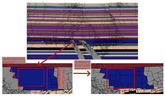More importantly, during this process, quasi-brittle rock exhibits tension–shear mixed ductile fractures, and natural and newly emerged structural planes exhibit separation, compression, and shear friction coupling responses (Figure 14). The above continuous-to-discrete conversion process is difficult to model by only using the FEM, FDM, or DEM [30]. Although some scholars have proposed research based on the FDEM framework [40,41], there are few studies on the laws of water-conducting crack propagation in overlying rock strata. Related studies also present a common limitation, that is, to only analyze simple geological structures. At the same time, in the above studies, coal seams are mostly regarded as discrete-block groups; after reaching a certain time threshold, discrete-block groups are instantly deleted for the purpose of working face advancement. Coal seam mining is a continuous process of generating and releasing mining stress, and stress is the root cause of coal and rock damage.
