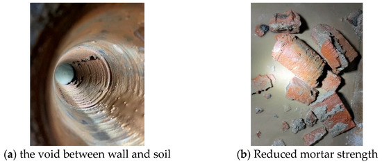 Taking the mortar in early underground civil defense projects in Beijing as an example, the average burial depth is about −10 m, and the surrounding areas are covered with loess or sand. The internal passages of the civil defense projects composed of mortar and bricks are mostly straight wall arch structures, and multiple layers of concrete will be sprayed on the surface during later reinforcement. As shown in Figure 2, through borehole inspection, a severe void phenomenon was found between the vertical wall and the adjacent soil, which provides a channel for soil and water erosion. Additionally, the connecting of mortar and bricks have been significantly affected by the environmental water, leading to a substantial decrease in strength, which will affect the overall stability and structural safety of the civil air defense engineering.