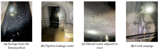 According to further investigation, it can be found that the environmental water erosion of the underground civil air defense engineering primarily includes adjacent rivers, surface rainwater, a damaged subsurface supplying pipes with water, and groundwater, as shown in Figure 3. The forms of environmental water intrusion into civil air defense spaces can be classified as permeation water that filters through the soil and flowing water that enters through conduits. Permeation water is typically clear and carries soluble ions from the soil, whereas flowing water has a complex composition, is generally turbid, and may even contain biological excreta and other contaminants. The composition and properties of different environmental waters vary due to their sources. For example, Na+, Cl−, and CO32− components were found in multiple underground waterproof environments.