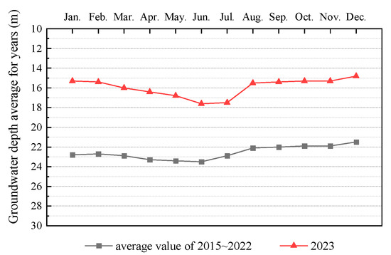 Usually, groundwater is significantly influenced by seasonal variations. As shown in Figure 4, the average groundwater depth in Beijing from 2015 to 2022 was around—23 m, while in 2023, the annual average depth of groundwater was approximately—17 m, indicating an upward trend. Particularly during the rainy season, precipitation quickly percolates into the groundwater, causing a rapid rise in the water table in a short period, sometimes even higher than the depth of the civil air defense structures. Overall, the civil air defense engineering is near groundwater for extended periods, and it is also significantly eroded by groundwater.
