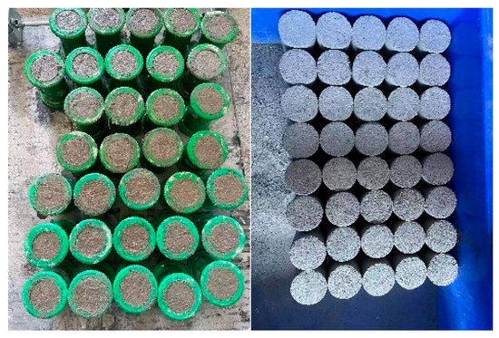 The mortar utilized in early subterranean civil defense structures was M7.5 masonry mortar, with a material mass ratio of “cement (325 Portland cement): quicklime (CaO): medium sand: water = 260:76:1400:324”. To investigate the mechanical properties of masonry mortar for early underground civil defense structures under water environment conditions, lime mortar samples were manually prepared in the laboratory using standard molds. The samples underwent curing under standardized conditions (temperature 20 °C, humidity 95%) for 7 days and were subsequently placed in natural surroundings (temperature 20~25 °C, humidity 30%~40%) for over 60 days. The sample set comprised 50 cylindrical specimens measuring φ50 × 100 mm and an additional set of 50 disc-shaped specimens measuring φ50 × 25 mm. Figure 5 illustrates the poured cylindrical cement mortar specimen.
