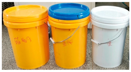 Underground engineering is subject to various water environments over time, and the environmental waters typically show complex ionic compositions and show weakly acidic or weakly alkaline properties. Common ions present in these waters include Na+, CO32−, HCO3−, and Cl−, among others. The experiment uses solutions to treat the samples by an immersion method. Different properties of environmental waters are simulated using H2CO3 solution, NaCl solution, and Na2CO3 solution. Three solutions are located in the barrels shown in Figure 6, respectively, for soaking the samples. The concentration of the three solution is 0.05 mol/L.