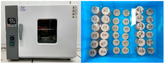 In underground engineering structures, the near-surface mortar exposed to alternating wet and dry conditions is particularly susceptible to damage. Therefore, the experiment uses an accelerated corrosion method through a wet–dry cycle. The wet–dry cycle protocol involves fully immersing the samples in water for 16 h, followed by drying in an oven at 105 °C for 8 h, which called one cycle. A total of three groups with cycle counts of 5, 10, and 20, respectively, are designated. There are 3 cylindrical samples of φ50 × 100 mm and 3 disc samples of φ50 × 25 mm in each group. After the accelerated corrosion cycles, uniaxial compressive tests, and Brazilian splitting tests are performed on these samples. Figure 7 shows the drying oven and samples during soaking.