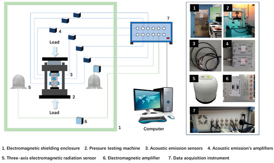 The loading control system utilizes the YAW-600 microcomputer-controlled electro-hydraulic servo pressure testing machine. The maximum test force is 600 kN, with a load resolution of 3 N, displacement resolution of 0.3 μm. The electromagnetic shielding system employs the GP1A detachable electromagnetic shielding device, within which both the loading control system and the acoustic emission–electromagnetic sensing system are included. The acoustic emission–electromagnetic sensing system includes sensors for monitoring electromagnetic radiation and acoustic emission signals, as well as corresponding amplifiers.