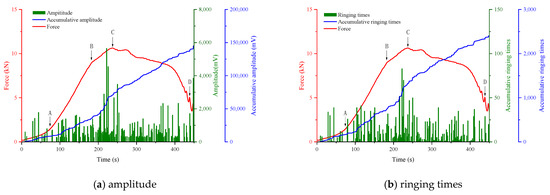 After the elastic deformation stage, some microcracks have formed inside the sample and the bearing capacity gradually decreases. At this stage, the energy has already accumulated, deformation begins to accelerate, and the load increases slowly. However, the acoustic emission signal shows obvious activity during this stage, with a sudden increase in the amplitude, ringing count, and cumulative energy values.