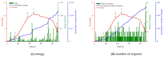 According to the loading-time curve and acoustic emission parameters of the mortar samples (No. DW-2, for 5 wet–dry cycles), shown in Figure 10, the acoustic emission signals of mortar samples were analyzed through four typical stages of deformation and failure.