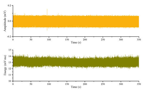 During the damage of the sample under load, energy will be released in various ways, such as electromagnetic radiation. The waveform and energy diagram of the electromagnetic radiation of the mortar sample are shown in Figure 11.