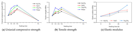 It can be observed that after immersing in four solutions (H2CO3 solution, NaCl solution, Na2CO3 solution, and water), the uniaxial compressive strength R, tensile strength σt, elastic modulus E, and compression failure energy Wcompr of mortar increase with the immersing time; tensile failure energy first decreases and then increases (initial strength: R = 5.42 MPa, σt = 0.68 MPa, E = 0.82 GPa, Wcompr = 6000 N mm, Wtension = 600 N mm). These strength values are larger than that of the mortar drilled from the civil defense site built 50 years ago (the performance of on-site mortar is R = 1.5 MPa, σt = 0.2 MPa).