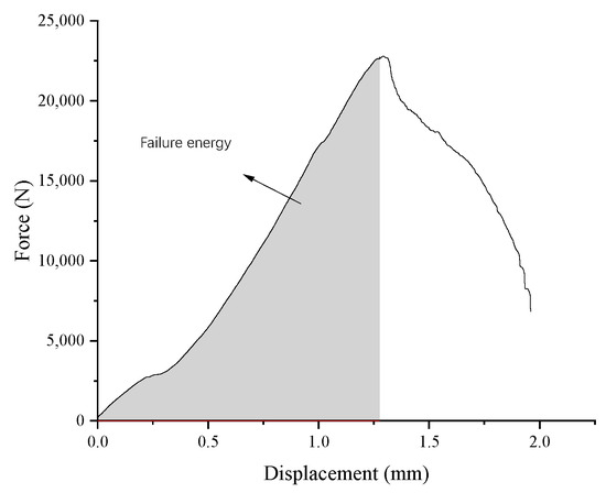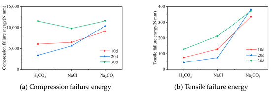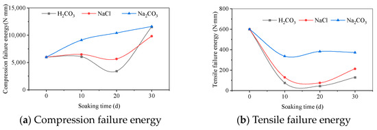 Figure 12 shows the variation in mortar samples’ uniaxial compressive strength, tensile strength, and elastic modulus with the increase in immersing time. And the failure energy of the sample is determined by the work conducted by the force from the beginning of loading to the maximum load, as shown in Figure 13. Figure 14 shows the variation in the compression failure energy and tensile failure energy with increasing immersing time.