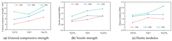 As shown in Figure 15 and Figure 16, the uniaxial compressive strength R, tensile strength σt, elastic modulus E, and failure energy W all increased after immersing in four different solutions. The values of the uniaxial compressive strength R, tensile strength σt, and elastic modulus E of mortar samples in these four different solutions are shown in the order of H2CO3 solution < NaCl solution < Na2CO3 solution < water.