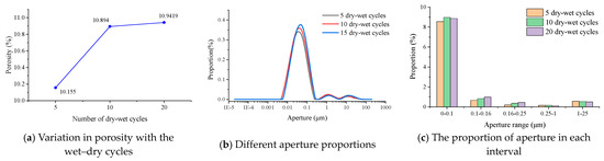 Wet–dry cycles can affect the pore size distribution and porosity of mortar. As shown in Figure 17, according to the magnetic resonance imaging analysis, it can be found that the porosity of the mortar increases with the number of wet–dry cycles increases (5–20 times), although the magnitude of the increase gradually decreases. The pore size of mortar is primarily distributed in the range of 0–0.1, as shown in Figure 17c. In this interval, the percentage shows a trend of increasing and then decreasing as the number of wet–dry cycles increases.
