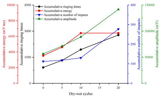 Variation in cumulative ring count, energy, amplitude, and number of impacts with the wet–dry cycles.