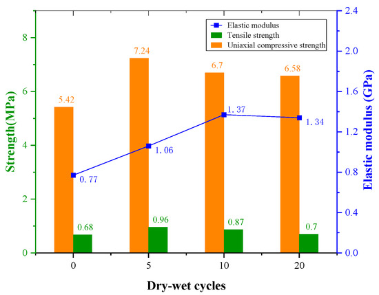 Compressive strength, tensile strength, and elastic modulus with the number of wet and dry cycles.