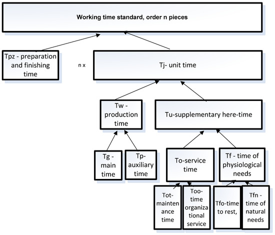 When planning the production process, not only the time related to the actual work is taken into account (the so-called main time Tg) but also other times, such as Tpz (preparation and completion time), Tj (unit time), Tw (production time), Tu (supplementary time), Tp (auxiliary time), To (service time), Tot (technical service time), Too (organizational service time), Tf (time of physiological needs), Tfo (time for rest), Tfn (time of natural needs).