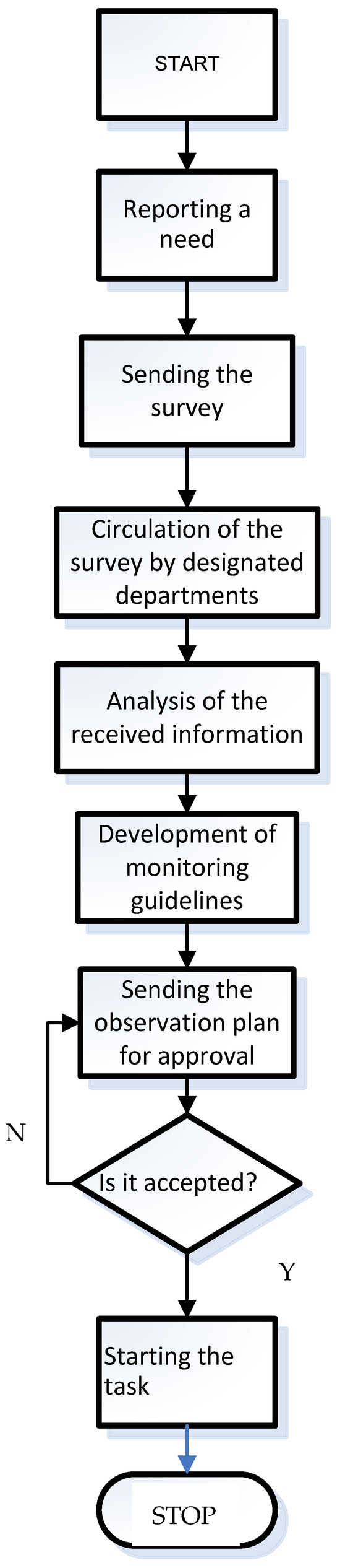Therefore, a survey was developed about the full range of areas that may be subject to such monitoring. Its aim is to exclude those areas, data or monitoring methods that either do not apply in a given place or are well known to the user who excluded them, or vice versa, precisely those areas the user indicated because his own experience says that it is this place that may be the source of the problem (as can be seen in File S1 in Supplementary Materials). In this way, the survey is used as a tool to systematize the knowledge available about disruptions in the process. Often, this knowledge is not collected in one place, and various parts of it are known to individual departments, i.e., technologists, maintenance, so it does not constitute common knowledge. This allows us to determine, at the very beginning, areas that are particularly difficult to analyze because they are at the interface between the competences of various departments in the company. The construction of the survey assumes its use in all departments of the organization: production, technology, maintenance, warehouse area. The assumption of the survey is that it should be completed by all people from various departments whose work is related to the monitored area. It was assumed that the questionnaire completed in this way is initially verified by the person conducting the research and then, in a closed form, as a description of the planned activities, it is returned to the organization for approval. The procedure is presented in Figure 3.