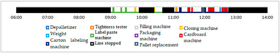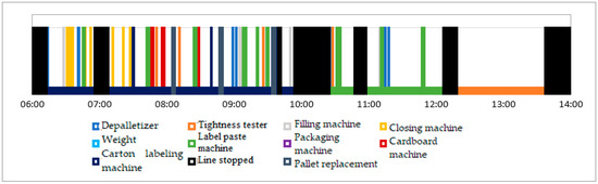 As can be seen, during the above-mentioned studies, downtime was caused by problems with various equipment—from label pasters to cartoners and closing machines. All this could be identified with the assigned time of a given event, which allows conclusions to be drawn about the cause of the disruption. In addition, the system enables productivity analysis compared to line stoppages. This is shown in Figure 7 and Figure 8.