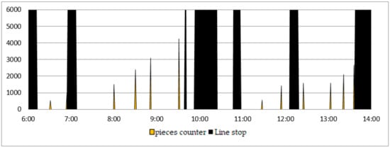 It is very important that the marked downtimes are described precisely. Foremost, downtime times, in which there is de facto no production (due to lack of raw materials, lack of orders or breakfast breaks), were excluded from these areas, because it happened that the lack of an order caused the line to stop for approximately 20% of the available time. Another important factor is determining the preparation times in which operators perform activities directly related to the operation of the line, the execution of orders they need to complete and in which the machine is not working. Both of the above-mentioned times must be clearly defined because the first one does not concern the operation of the line at all and would introduce errors in the analysis. However, the second of these times is necessary for the operation of the line but directly limits its availability and, most importantly, cannot be eliminated. It is even more important to know the actual preparation time, because not including it in production plans from the very beginning generates errors and alleged losses for the company. In this way, the actual, real and highly analyzable time of line availability is obtained. By conducting the analysis in this way, we can determine in great detail which aspects of production, i.e., method of operation, method of loading, operation of device structure, have an impact on micro-downtime and, as a result, cause the greatest threats to the stability and safety of production, which is not possible without the above studies, records and analyses to be carried out.