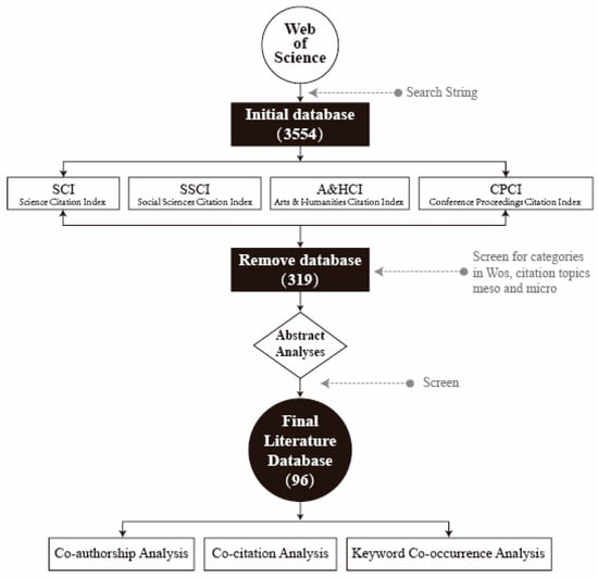 The Web of Science (WoS) has long been considered the most authoritative scientific literature retrieval tool, providing access to key scientific research fields [17] In this study, we expanded the literature retrieval of the “Web of Science Core Collection” to include the Science Citation Index Expanded (SCIE), Social Sciences Citation Index (SSCI), Arts & Humanities Citation Index (A&HCI), and Conference Proceedings Citation Index (CPCI). The data was obtained from the library of the University of Bologna, Italy. To obtain comprehensive data, we tracked data up to 22 January 2024, and initially used the keyword combination ((((TS = (industrial building)) OR TS = (plant))) OR TS = (factory)) OR TS = (industrial)) AND TS = (canal)) OR TS = (artificial waterway)) NOT TS = (medicine), which yielded 3554 documents. Subsequently, we selected documents from SCIE, SSCI, A&HCI, and CPCI databases, excluding literature unrelated to canal transportation such as medicine, biology, and geology, for example, Dentistry or Surgery Medicine or Marine Freshwater Biology or Neurosciences or Cell Biology or Plant Sciences, resulting in 319 documents related to canal-related industrial building research. Finally, we conducted a comprehensive review of the abstracts of the 319 articles, further excluding articles discussing riverbeds, sediments, and other topics unrelated to buildings along canals, resulting in the extraction of 96 closely related documents, which were saved as plain text files. The content recorded, comprehensive records, and exported references were used for subsequent analysis (as shown in Figure 1).