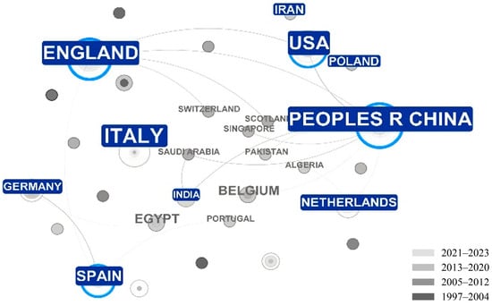 Figure 3 presents a network analysis of country co-authors, revealing the dissemination of research on canal-related industrial buildings among various countries. When an article’s authors are from different countries, the article will be assigned to each author’s represented country. This is because research articles typically represent the collaborative efforts of multiple authors and institutions from different geographical regions [22]. Therefore, co-authorship analysis clarifies the national and international cooperation among authors and the contributions of authors from different countries to the research. It also provides insights into the scope and impact of cooperation among different countries and regions in research. In this network, each node represents a country, and the size of the node is proportional to the number of publications from that country. The blue ring around the node represents higher betweenness centrality, indicating that these nodes are critical points linking different parts of the network. The thicker the blue ring, the higher the centrality of the node [23].