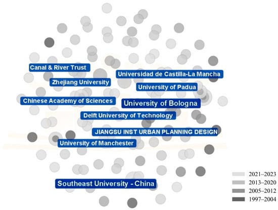 This paragraph maps and visualizes the institutional collaboration relationships in the research field of canal-related industrial buildings. Similar to the analysis of country co-authors, the size of the nodes indicates the number of publications. Figure 4 and Table 2 display the top 10 academic institutions in terms of the number of publications on canal-related industrial buildings. From the graph, it is evident that most institutions in the network appear to be independent, without significant connecting relationships. This indicates that cooperation among institutions is not comprehensive enough, and institutions tend to collaborate more with institutions from the same country. Additionally, due to the refinement of research topics, the limited research sample size results in a relatively small and uniform distribution of publications allocated to individual institutions. Among them, the institutions with the highest publication volume are the University of Bologna in Italy (three articles) and Southeast University in China (three articles). The institutions of Zhejiang University, the University of Padua, the University of Manchester, the Universidad de Castilla-La Mancha, Jiangsu International Urban Planning Design, Delft University of Technology, the Chinese Academy of Sciences, and the Canal & River Trust each have two articles. Among the top ten institutions, the University of Bologna and the University of Padua are located in northern Italy, with a total of five published papers. Their research revolves around the Milan artificial waterway and research related to the Venice Canal [32,33,34]. The four Chinese institutions collectively published nine articles, all focusing on research topics related to the Grand Canal of China and industrial buildings. These include segments of the Grand Canal in China and Hangzhou [35,36], and these four institutions are located near the Grand Canal in China. Among the top ten research institutions, England occupies two positions, one being the University of Manchester and the other being the largest waterway charity organization in the ENGLAND, the Canal & River Trust, with a cumulative total of four articles. Established in 2012, the Canal & River Trust is the largest waterway charity organization in the ENGLAND, dedicated to maintaining a network of canals and navigable rivers spanning 2000 miles. The organization has conducted surveys of buildings around canals, counting over 2700 protected buildings, 50 listed ancient monuments, and 4 UNESCO World Heritage Sites Along British canals. Through discussions on canal heritage and industrial buildings, the organization hopes to attract more attention to canal architecture. In these four articles, discussions primarily revolve around the Manchester Canal and the work completed by the Canal & River Trust in managing and protecting buildings [37,38]. Universidad de Castilla-La Mancha is an academic institution in Spain that ranks in the top ten institutions in terms of the number of publications with two articles. The institution primarily focuses on research themes related to modern roads proposed by UNESCO, including discussions on inland water transportation in canals and industrial archaeology-related buildings [39,40]. Delft University of Technology in The Netherlands published two studies. One revolves around pollution issues in the ecological environment caused by factories near the canals in Skikda port in the northeastern Algerian city on the Mediterranean coast [41,42]. The other study is a collaborative effort with Tianjin University in China, focusing on research results related to the architectural heritage around the Tianjin section of the Grand Canal in China.