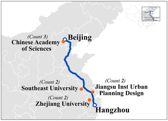 Overall, most institutions primarily focus their research efforts on canals within their respective nations, with minimal cross-border collaboration facilitated by international exchanges. Additionally, our investigation reveals a close nexus between the top ten institutions and the canals themselves. Notably, a significant portion of the core research emanates from academic entities closely intertwined with and situated in proximity to canal resources. For instance, the Moline Canale flows into the urban area of Bologna [43] the locale of the University of Bologna (Count3). Similarly, Parma University benefits from its proximity to the Venetian Grand Canal and its surrounding urban areas, rich in canal resources [44] (Count 2). The University of Manchester, situated near the Manchester Ship Canal, and the Canal & River Trust, located in the vicinity of Regent’s Canal in London, also contribute significantly to canal-related research [44,45] (Count 2 each). Moreover, among the top ten Chinese institutions in terms of research output, four are situated near the Grand Canal of China. Furthermore, a substantial portion of their pivotal research originates from academic institutions deeply intertwined with canal resources and situated near them, as illustrated in Figure 5. This underscores the acute attention these institutions pay to the local geographical milieu and resources during their research endeavors, as well as their contributions to the development and cultural heritage preservation of their respective national canal regions.