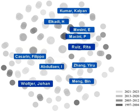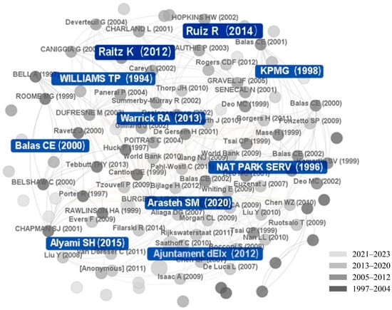 The analysis of co-citation among authors not only reveals the distribution of highly cited authors within an academic field, but also identifies scholars who have had the most profound impact on the field. Furthermore, it allows us to understand the similarity between researchers and the distribution of their research topics within the disciplinary domain [60]. In this study, we utilized CiteSpace to construct Figure 9, where each node represents a scholar, and the links between nodes represent their co-citation relationships. The size of nodes indicates the frequency of citations received by authors, while the distance between nodes reflects the frequency of co-citations between two scholars. Larger nodes signify higher importance for the authors, while closer distances indicate greater similarity in research directions between two scholars [61].