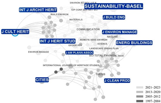 A total of 96 papers on industrial buildings related to canals were indexed in 33 journals, predominantly in authoritative outlets (as shown in Table 4). Among these, the most frequently cited journal is “Sustainability” (9), an international journal focusing on human-environmental, cultural, economic, and social sustainability, providing a broad perspective and framework for research in the field of industrial buildings related to canals. Subsequently, journals ranked 2nd, 3rd, and 4th have a citation count of six each. “International Journal of Heritage Studies” is an interdisciplinary scholarly reference journal primarily addressing leading and cutting-edge international resources in heritage politics, culture, management, and economics. “Journal of Cultural Heritage (J CULT HERIT)” mainly focuses on cultural heritage preservation and awareness. “Cities” is a journal focusing on urban politics, theories, governance, and smart cities. Following these, journals ranked 5th and 6th in citation count are “ENERG BUILDINGS” and “International Journal of Architectural Heritage (INT J ARCHIT HERIT)”. The former concentrates on building energy usage and efficiency, while the latter emphasizes research on historical buildings and structures as well as papers related to architectural restoration. The remaining four journals in the top ten by citation count, each with a count of four, are “Journal of the American Planning Association (J AM PLANN ASSOC)”, primarily focusing on planning and urban development perspectives; “Journal of Cleaner Production (J CLEAN PROD)”, devoted to research and practices on clean production, environment, and sustainable development; “Journal of Environmental Management (J ENVIRON MANAGE)”, associated with managing environmental systems and improving environmental quality; and “Journal of Building Engineering (J BUILD ENG)”, covering scientific and technological aspects related to the entire lifecycle of building environments. Among the top ten journals, “Journal of Cultural Heritage” exhibits a higher degree of centrality, indicating its pivotal position and influence within the academic journal network. This underscores the importance and influence of this journal in the field of industrial buildings related to canals. In contrast, although the journal “Sustainability” has a higher citation count and significant influence within the research domain, its centrality within the academic journal network is relatively lower. Overall, these journals cover multiple domains, including sustainable development and environmental management, cultural heritage preservation, architecture, and energy, as well as urban planning. This reflects the interdisciplinary and comprehensive nature of research in industrial buildings related to canals.