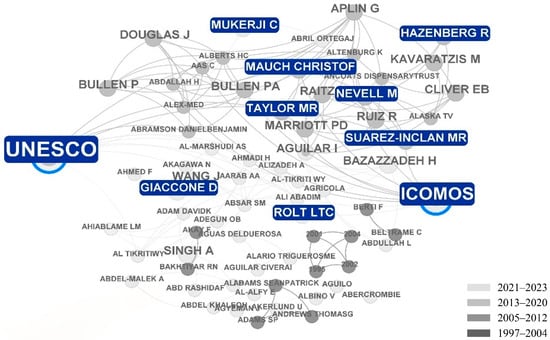 Figure 6 illustrates the collaboration network of the top 10 authors in the field of research on canals and industrial buildings. This network was generated by selecting appropriate units, setting thresholds, and excluding isolated nodes, with the size of the nodes proportional to the number of papers authored by each author [46]. A total of 176 authors participated in research on topics related to canals and industrial buildings, contributing to a total of 96 papers. As shown in Figure 6, the entire network consists of a series of isolated small sub-networks without forming large-scale clusters and connections. This indicates that authors in the research field related to canals and industrial buildings tend to collaborate in small-scale cooperative groups, lacking broader exchanges with each other. In Table 3, among the top 10 scholars, Spanish scholar Rita Ruiz published two academic papers as the first author in research related to canals and industrial buildings. British scholar Johan Woltjer published one paper as the first author and one as the second author on topics related to canals and industrial buildings. The number of related studies by other scholars is one, and they have only completed one academic research project related to canals and industrial buildings by collaborating with other scholars. This once again emphasizes that authors in this research field tend to assist in small-scale cooperative groups, lacking broader collaboration and exchanges, and lacking sustainability in research trends related to the research topic.