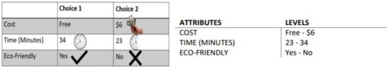Previously, DCE methods have been extensively used to accurately measure and further understand consumer behaviours in a wide range of domains, such as transport choices, health choices and consumer choices [52,53,54]. These use cases for DCEs have been shown to have strong external validity and criterion validity, showing that stated choices within the tasks were seen to be consistent with real choices made by the same individuals, indicating that DCEs can reasonably predict behaviours [55,56,57,58]. The use of DCEs when examining pro-environment behaviours may allow for the analysis of which factors are most important to individuals when making pro-environment decisions. This analysis may allow us to determine what societal and governmental changes may be required to make pro-environment options more appealing. For experiments focusing on pro-environment behaviours, factors may include, but are not limited to, trade-offs between cost, time, social pressures, convenience or eco-friendliness. Examining trade-offs will identify how we may make pro-environment options more appealing.