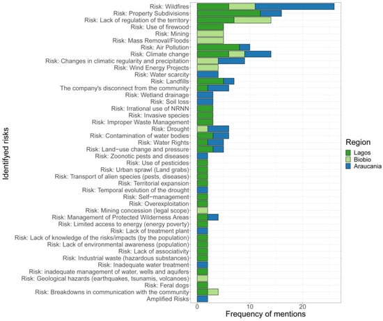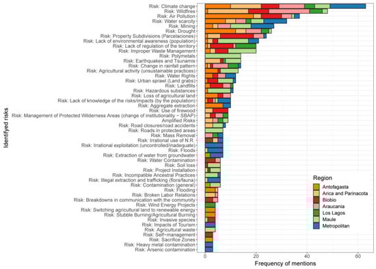 (3) The differentiated configuration of established risks shows difficulties for government organizations in deploying operations in the face of socio-environmental risks and threats, as these organizations attempt to incorporate and transmit risk as an organizing operational criterion [34,65]. In certain sectors, this situation results in the isolated treatment of impacts, inadequacies in preventive measures, and difficulties with inter-institutional coordination in addressing shared socio-environmental risks, both within and between regions. However, it is noteworthy that some agencies tend to emphasize their efforts in coordinating with other institutions to address certain risk areas. This presents important regulatory challenges for Chile, such as reconciling sustainable development with ancestral socio-productive practices (such as cultivation on steep slopes and land burning), establishing new protected spaces under national legislation (such as Marine Protected Areas or urban wetlands), and developing plans for the decontamination of air pollution and freshwater sources.