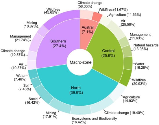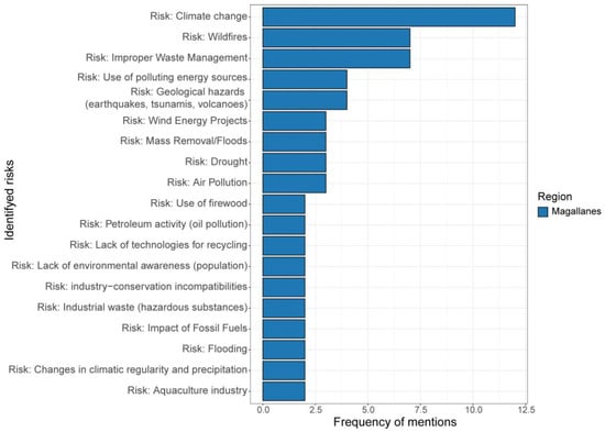 Finally, for the Austral Macrozone (Figure 8), represented by the Magallanes region, improper waste management emerges as the primary concern. This socio-environmental risk seems to be associated with the high cost of waste management, leading people to seek inadequate alternatives for waste disposal. Forest fires are a problem because of their impact on native forests. Although it is considered a controlled risk in the region, the effects of climate change and its anthropogenic origins make it a persistent institutional concern.