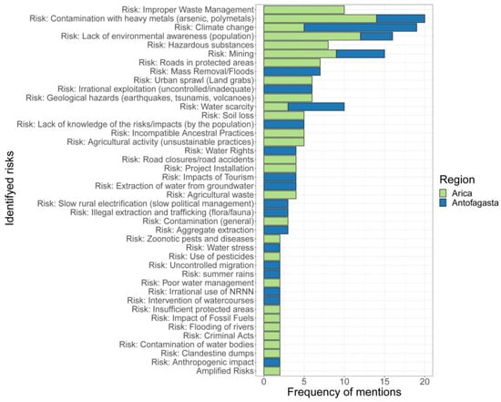 The findings of narrative analysis reveal interesting parallels in the differentiated configuration of socio-environmental risks in Chile. Notably, the informants expressed shared concerns, such as the transport of hazardous substances, as noted by the SENAPRED and the CONAF in Arica and Parinacota (I4-I7). This issue is linked to the harm caused by the production and use of polymetals, which pose a threat to human health and freshwater ecosystems, particularly in the Northern Macrozone, as highlighted by the SEREMI of Health and the SEREMI of the Environment of Arica and Antofagasta (I1-I2-I8-I9). Another significant convergence is the risks associated with unauthorized land holdings in the same macrozone, which is of particular concern to authorities such as the SEREMI of the Environment and the DOH in both regions (I2-I9-I12). Furthermore, the CONAF and DOH authorities in the same macrozone (I7-I12-I15) also draw attention to various persistent difficulties in the field, which include traditional farming methods and environmentally harmful practices, such as burning and specific irrigation techniques.