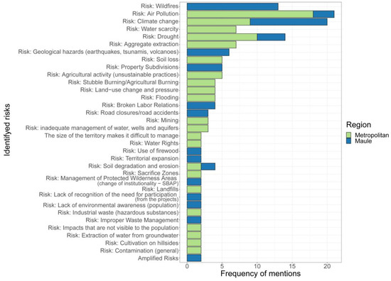 The results demonstrate a distinct pattern of socio-environmental risks at the macrozone level, which are influenced by the socio-productive and ecological vocations of each region. In the Northern Macrozone, as depicted in Figure 5, the primary institutional concerns involve risks associated with contamination from heavy metals and hazardous substances, as well as those related to mining. In contrast, the Central and Southern Macrozones, as illustrated in Figure 6 and Figure 7, the primary concerns center on water scarcity and aggregate extraction, which are compounded by a diverse array of socio-environmental risks, including forest fires, property subdivisions, and a lack of regulation of the territory. Furthermore, air pollution is considered as a pressing issue, particularly because of the widespread use of firewood.