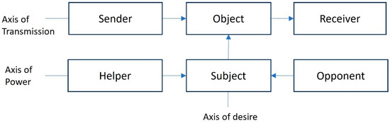 3.2. Greimas’s Actantial Model and Its Components