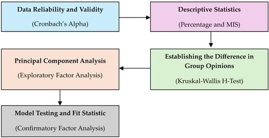 As shown in Figure 1, a total of 15 indicators were found and initially evaluated using the mean item score (MIS) resulting from the literature review. The Kruskal–Wallis H-test was employed to determine whether the community responses differed significantly. Additionally, using IBM SPSS Statistics for Windows, Version 25.0, an exploratory factor analysis (EFA) was performed to assess the components’ one-dimensionality and factor analysis potential. The measurement structure of a group of indicators was examined using EFA [56].