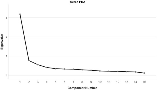 Three aspects or components with an eigenvalue > 1 were extracted from the measurement indicators, and Figure 2 and Table 4 show the use of PCA in the varimax rotation. The cumulative variance was calculated as 60.016%, exceeding the study’s 50% cutoff point [58].