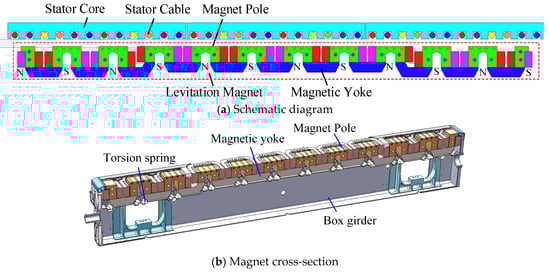 Nowadays, magnetic levitation (maglev) technology has been widely commercialized in high-speed machinery due to its advantages of no friction, micro-vibration, long life, high precision, and so on. As a core component for rotating machinery, magnetic bearings are generally applied to support high-speed rotor contactless, such as maglev flywheels, maglev control moment gyroscopes, and maglev motors [1,2,3,4]. Regarding linear motion, the magnet and linear motors are combined and applied; the magnet realizes levitation and the linear motor is used for propulsion, such as the maglev train and the maglev elevator. So far, maglev train technology has been researched for a long time in the world. Several countries have successfully implemented maglev projects for commercial operation, while others are currently in the planning stages for similar ventures, such as China, Germany, Japan, South Korea, etc. [5,6,7,8]. According to operating speeds, the maglev train can be classified into middle–low- and high-speed types. The maximum speed of the middle–low-speed maglev train approaches 200 km/h. A U-type magnet has been designed to achieve integrated levitation and guidance. Here, the levitation is actively controlled to maintain stability and the guidance is passive due to smaller lateral interference forces at lower speeds [9,10,11]. The maximum speed of the high-speed maglev trains is over 300 km/h, even reaching 600 km/h. At present, there are main two technical routes: superconducting electrodynamic suspension (SCEDS) vehicles from Japan and electromagnetic suspension (EMS) Transrapid technology from Germany. SCEDS vehicles achieve passive levitation and guidance via the passive repulsive forces generated by the dynamic interaction between the superconducting magnets and the ground coils. It is crucial to design the superconducting magnet itself and match the relationship with the ground coils to ensure stable levitation [12,13,14]. The SCEDS vehicle L0 in Japan is in the trial operation stage and its maximum experiment speed reaches 603 km/h, but it is not available commercially yet. At present, the technical route of EMS is most mature and the EMS Transrapid TR08 manufactured by German firms has been operating commercially for nearly 20 years in Shanghai, China. The maximum experiment speed reaches 505 km/h and the maximum operation speed reaches 430 km/h. The levitation and guidance functions are achieved through active magnetic attraction forces generated by corresponding magnets, which are dynamically controlled to ensure stability, especially under the significant vertical and lateral loads experienced at high speeds [15,16,17]. The active electromagnetic control plays an important role in maintaining the stability and comfort of the vehicle, so many advanced levitation and guidance control algorithms have been researched and proposed by scholars [18,19].