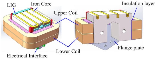 The magnet pole, a crucial component of the powered excitation in magnet, as shown in Figure 2, comprises an iron core, coil, an insulation layer linear generator (LIG), and a flange plate. Similar to the magnetic yokes, the iron core is constructed by laminated silicon steel sheets. The upper and lower coils are connected and wound around the iron core, consisting of aluminum foil and insulating film arranged in alternating layers. An insulation layer is positioned between the iron core and the coil, playing an important role in protecting the coils from the short circuit failure with the iron core. Embedded within the iron core and sharing the magnetic field of the magnet pole, the LIG facilitates induction power generation. The magnet pole is encapsulated with epoxy resin and fixed on the girder through the aluminum alloy flange plate.