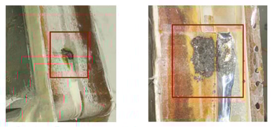 During the long-term operation of the maglev train, the magnet pole frequently experiences insulation failure, resulting in increased maintenance workload and operating cost. After the large-scale disassembly of failure magnet poles, insulation fault points are identified and located on the insulation layer between the coils and the iron core, as illustrated in Figure 3. The damage of the insulation layer indicates that the voltage at this position exceeds the long-term operation voltage withstand test standard of 2.5 kV for the maglev train. While the maximum power supply voltage for the magnet is only 440 V. To analyze the mechanism of voltage formation, an electromagnetic coupling model of magnet is constructed, and tests are performed.
