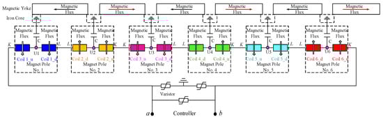 The electromagnetic coupling model of the half magnet is depicted in Figure 4. In a control circuit, six magnet poles are connected in series and powered by a controller. The coil can be equivalent to a series of resistors and inductors. Varistors are connected at points a and b to suppress the overloaded input voltage. As mentioned previously, the coil is composed of alternating layers of aluminum foil and insulation film, with an insulation layer between the coil and the iron core. Thus, parasitic capacitance exists between the coil and the iron core. When the coils are energized, the magnetic fluxes are generated by the magnet pole core, passing through the long stator, adjacent magnet pole cores, and magnetic yokes, and then they finally return to the initial position. If the magnetic flux in the magnetic circuit fluctuates, an inductive voltage will be induced from points U1 to U6 between the coil and the iron under electromagnetic coupling effects.