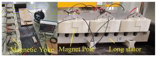 To study the magnet characteristics, a magnet test platform, depicted in Figure 15, is constructed. The gap between the magnet and long stator is adjusted and maintained by the hydraulic system. The loop current ranges from 0 to 50 A, with increments of 5 A. The magnetic force is measured by the force sensor.