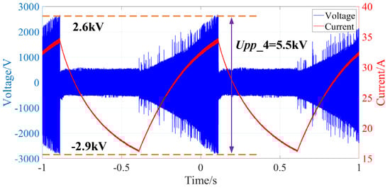 As depicted in Figure 6, an equivalent ground test setup is established to facilitate the inductive voltage test and analysis. An actual controller is utilized for power supply, and the loop current is regulated to a nominal current of 25 A, augmented with a wave function with an amplitude of 10 A and a frequency of 1 Hz. This setup effectively simulates the inductive voltage characteristics of the actual operation. In the test results, the high voltages appeared at the points U1 to U6, especially the points U3 to U5. The inductive voltage result of magnet pole no. 4 (point U4) is extracted and displayed in Figure 7. As the current increases, the inductive voltage increases. Two maximum voltage peaks are recorded separately at 2.6 kV and −2.9 kV, resulting in a maximum peak-to-peak value of 5.5 kV. This value surpasses the withstand test voltage standard of 2.5 kV, thus elevating failure risk.