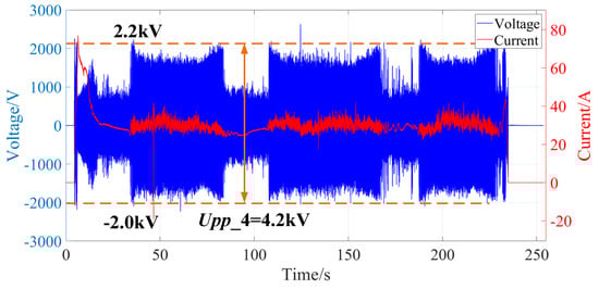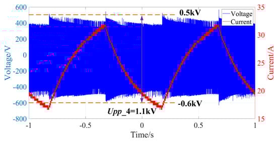 The inductive voltage of magnet pole no. 4 is tested at a lower speed of 50 km/h in the actual vehicle, and the results are displayed in Figure 8. The loop current is maintained at around 27 A with minimal fluctuation. At this moment, the two maximum voltage peaks are 2.2 kV and −2.0 kV, and the maximum peak-to-peak value is 4.2 kV lower than that recorded in the ground test results.