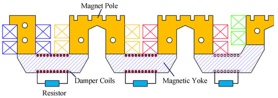 Based on failure analysis, the inductive voltage is intimately affected by magnetic flux fluctuation in the magnetic circuit. As aforementioned, the magnetic yoke is formed by laminated silicon steel sheets with excellent magnetic permeability and eddy current suppression abilities, making it difficult to suppress the magnetic flux fluctuation. Structural steel has been recommended for magnetic yoke once before. Although it can suppress magnetic flux fluctuation well by relying on the eddy current effect, the lower magnetic permeability will weaken the carrying capacity of the levitation magnet. Furthermore, the low-frequency magnetic flux regulation from the control current can also be suppressed, impacting the control system response. The magnetic flux fluctuation that generates a high inductive voltage falls in a higher frequency range over 100 Hz or even up to 1000 Hz. Subsequently, a novel magnet with damping coils is designed, as shown in Figure 9. The magnetic yoke is embedded with a damping coil to ensure external dimension. The coil is wound with copper enamel wire and connected in series with a resistor to form a closed loop. By adjusting the turns and resistance of the damping coil, high-frequency magnetic flux fluctuation can be suppressed while minimizing the impact on the control magnetic flux. In the following, the mathematic model of the novel magnet is established to efficiently analyze the electromagnetic characteristics.