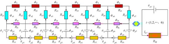 To simplify the calculation model, only a half-magnetic circuit model is constructed, as the levitation magnet is controlled separately by the left and right loops. Meanwhile, to mitigate the impact of magnetic field coupling between the two loops, the seventh magnet pole is included in the half-model. The EMC model is illustrated in Figure 10. Raj is the reluctance of the air gap between the magnet pole and stator. Rsi is the reluctance of the stator core. Rei is the reluctance of the magnet pole core magnetic yoke and Rli is the magnetic leakage reluctance between the adjacent magnet poles. ϕaj, ϕi, ϕei, andϕli are the magnetic fluxes corresponding to the reluctance values Raj, Rsi, Rei, and Rli, respectively, andϕpj is the magnet pole flux. θj is the magnetomotive force of the pole coil and is equal to nI, where n is the number of pole coil turns and I is the control current. θpj is the magnetomotive force of the damping coil and equal to npIpi, where np is the number of damping coil turns, and Ipi is the inductive current. Here, i = 1, 2…6, j = 1, 2…7. The resistance series connected with each damping coil is Rdp.
