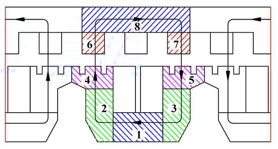 - The reluctances of the stator core, pole core, and yoke can be calculated via segments, and the sectional area of each segment should be as similar as possible. The specific sections are shown in Figure 11, where the pole core and yoke are divided into five sections and the stator core is divided into three sections. The nonlinearity of magnetic materials is considered in the reluctance calculation.
